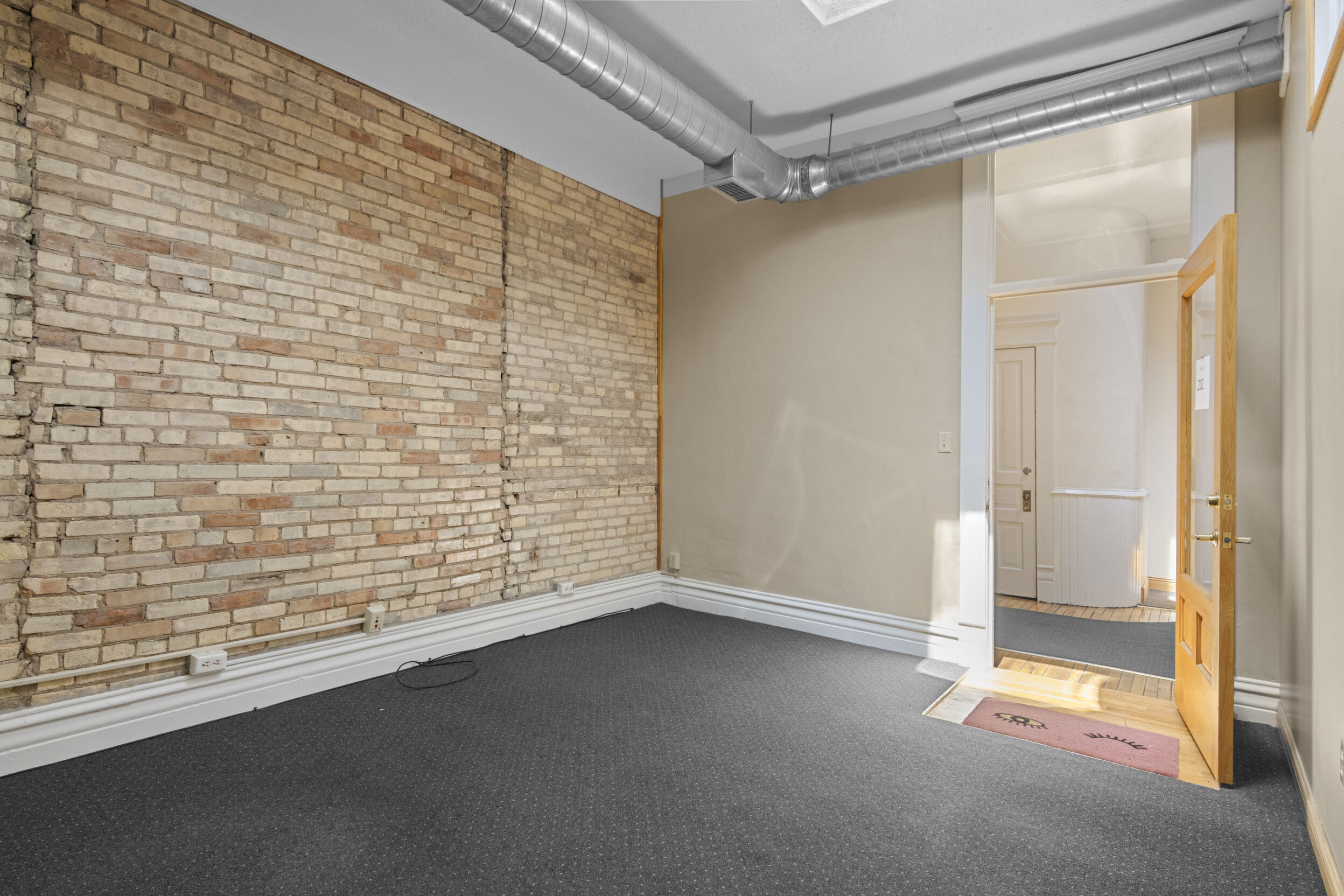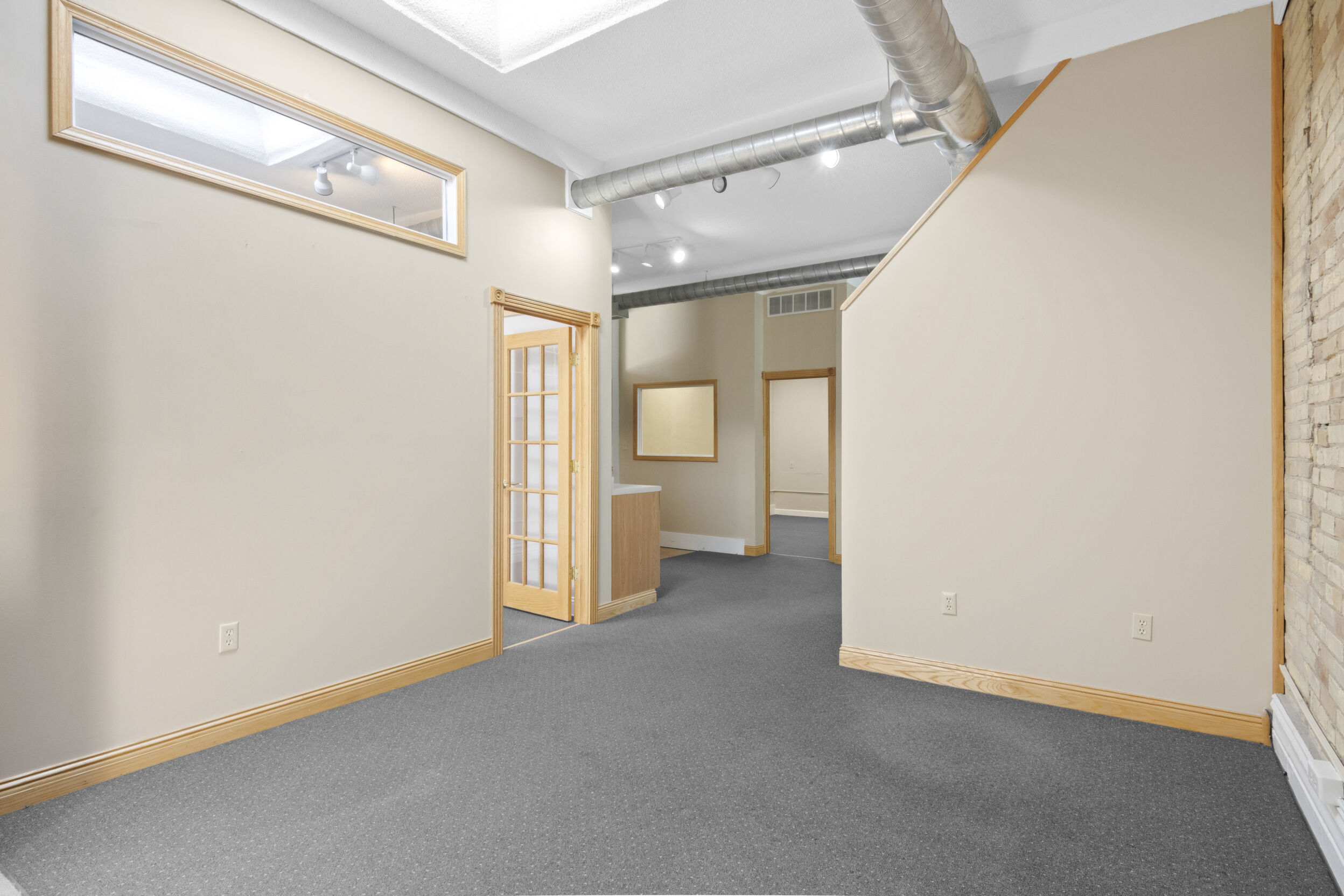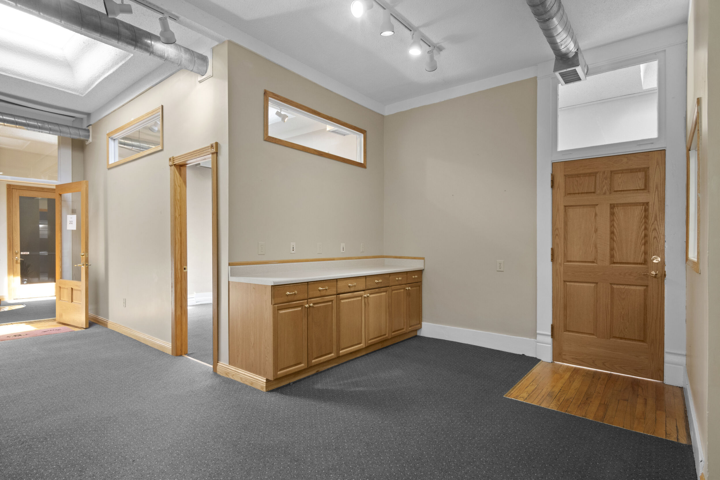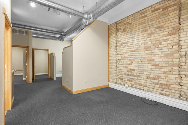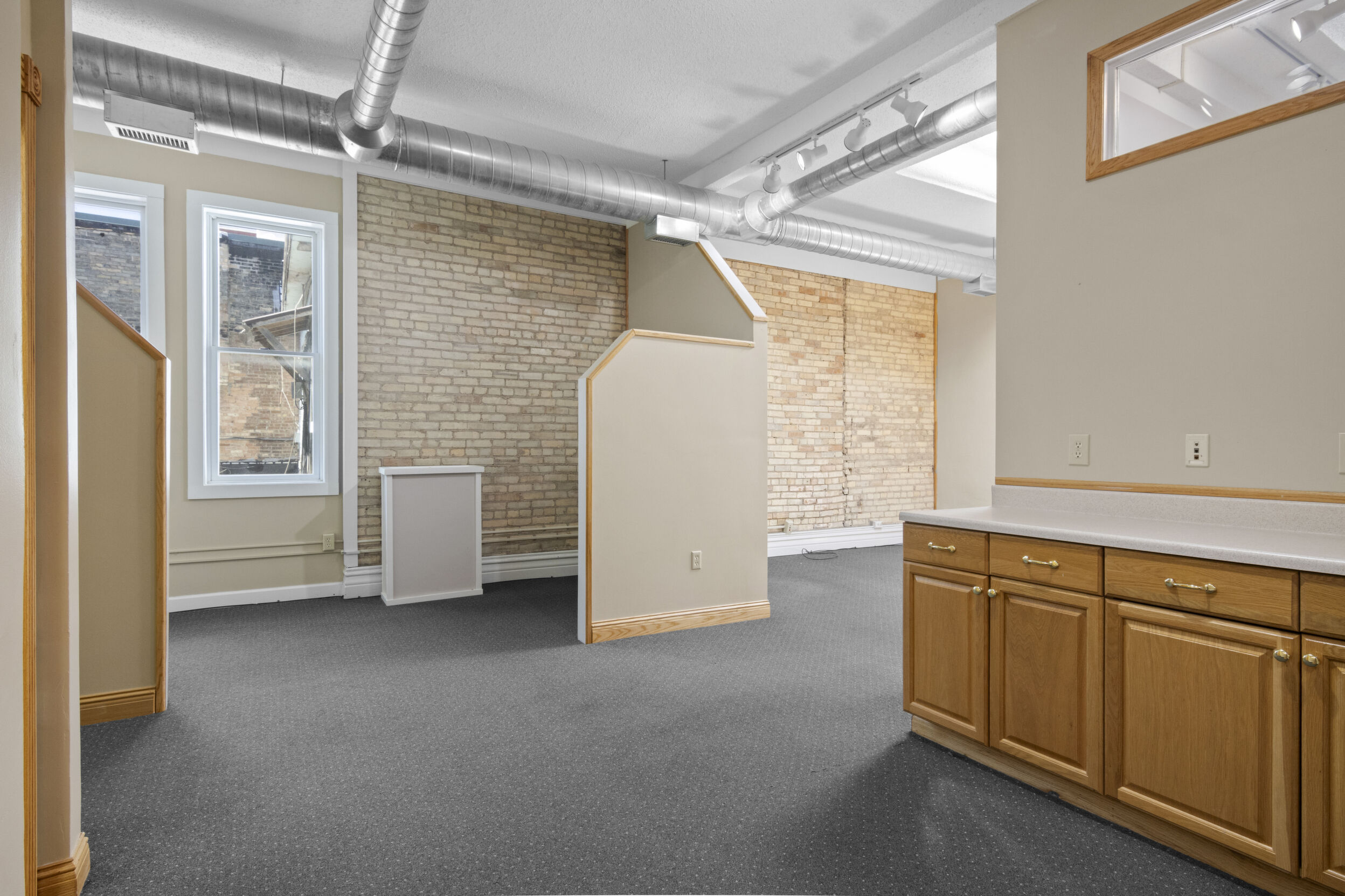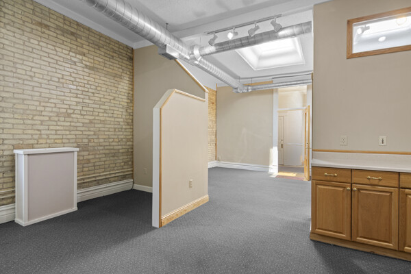 DOWNTOWN OFFICE SPACE! Suite 202. Renovated Upper Floor Office Space Includes 3 Private Offices -2 Work Stations - Built in Counter & Cupboards - French Glass Doors to Offices - Original Refinished Brick Walls - High Ceilings w/Exposed Ductwork - Skylights - Windows - etc. Rent Includes Electricity. Tenant Responsible for: Natural Gas/Heat - Trash - Phone/Computer. Shared Kitchenette & Restrooms & Hallway are nicely finished. Accessed by Wide Staircase to Front St & Rear Staircase to Alley.