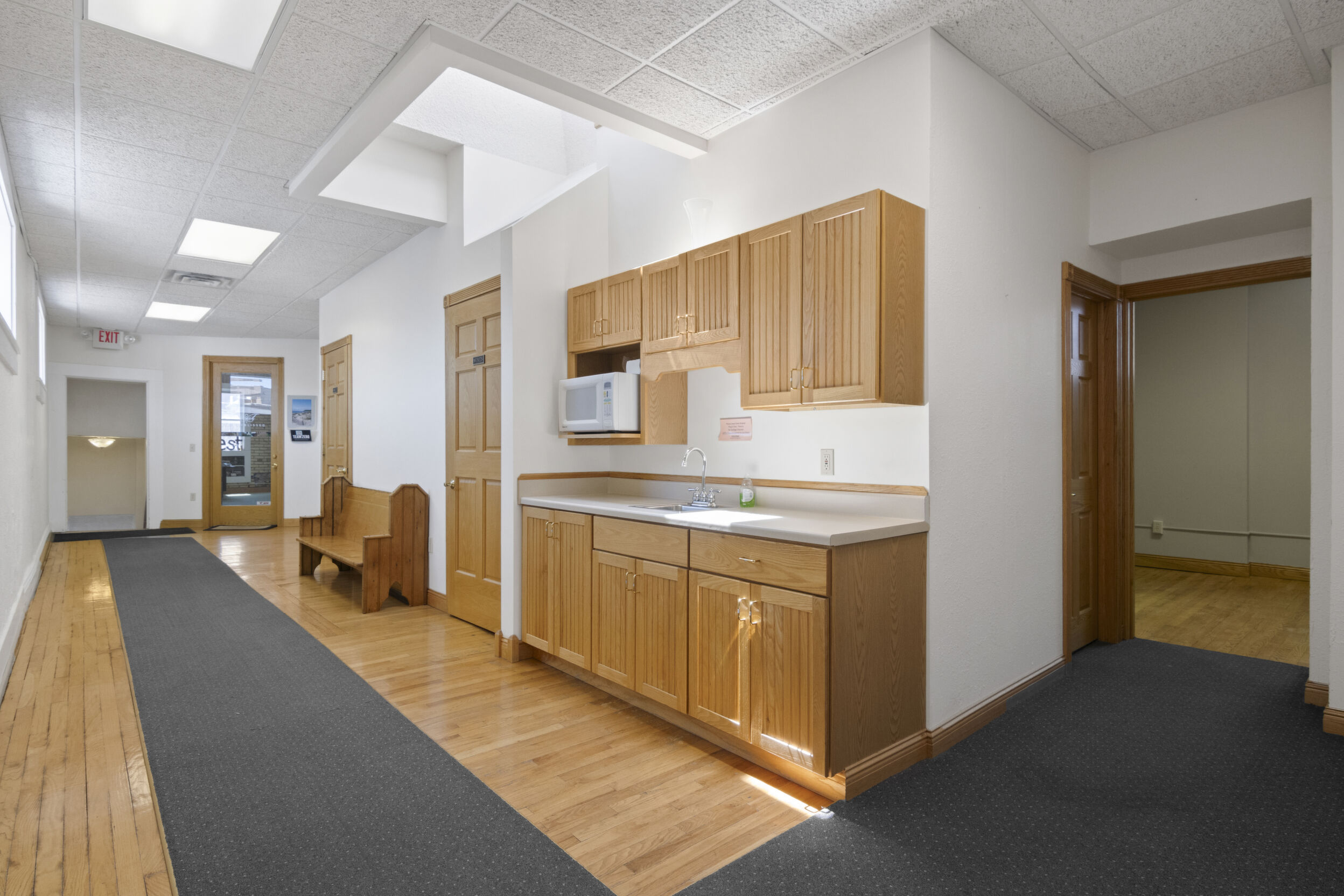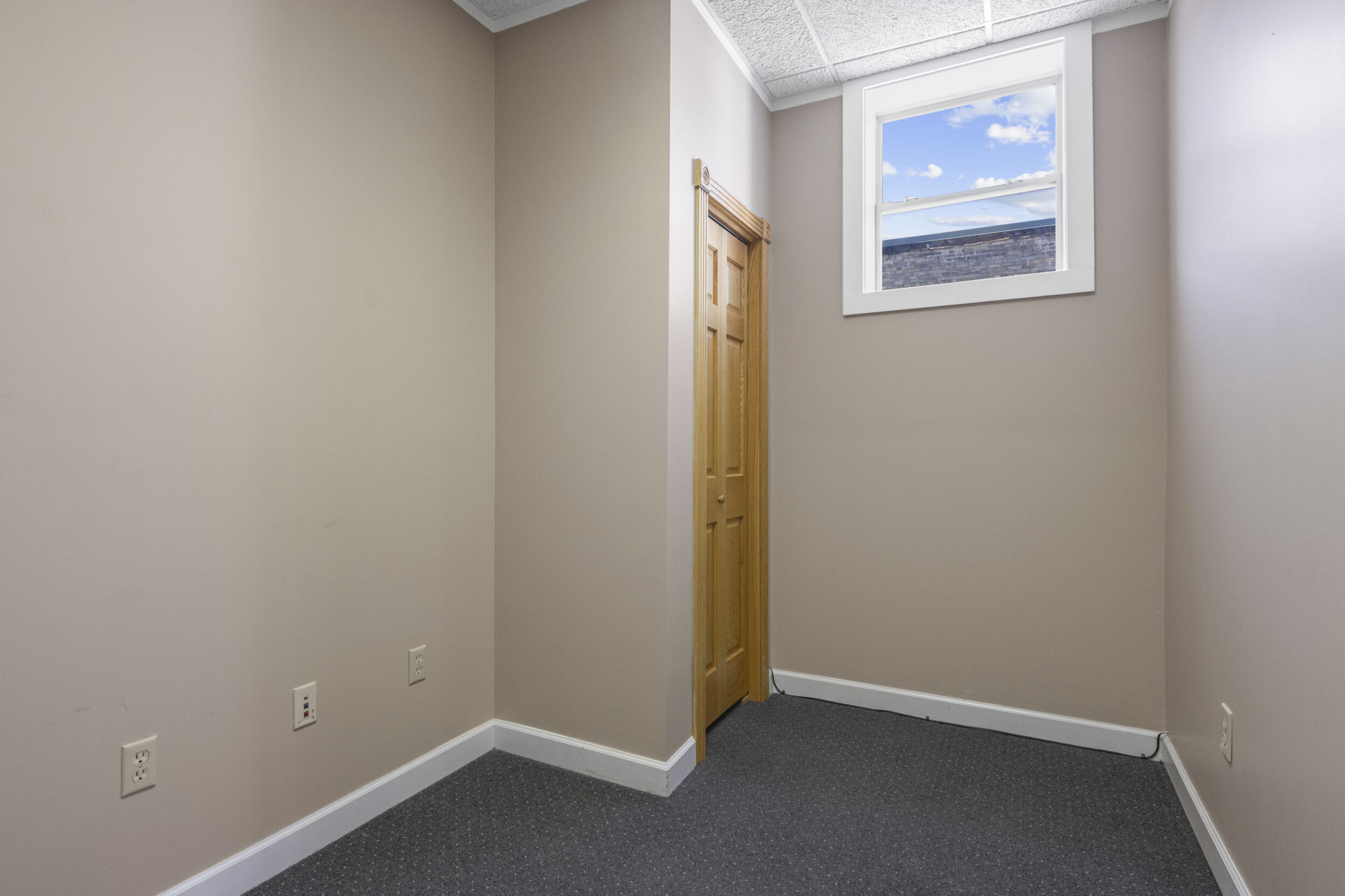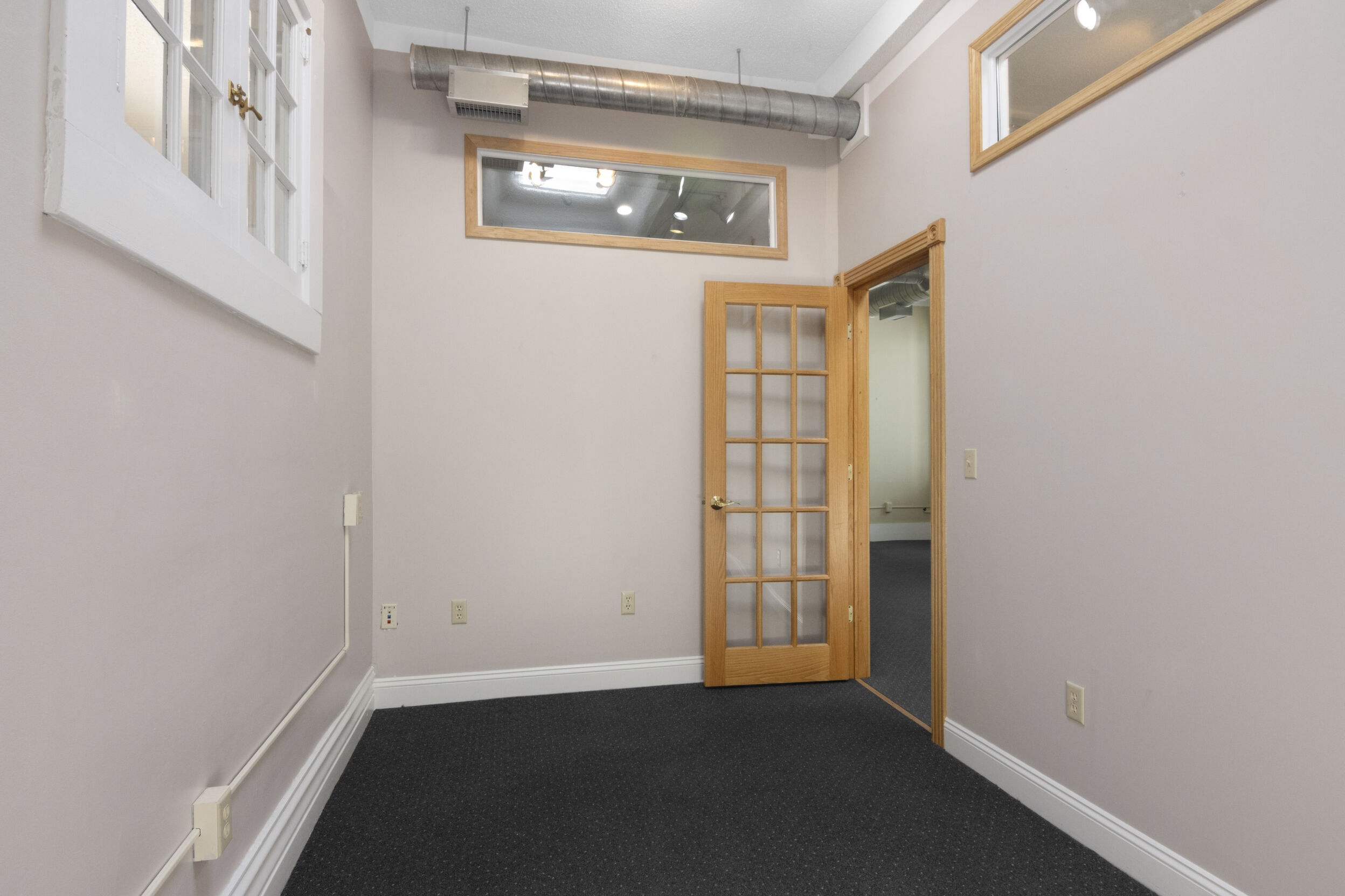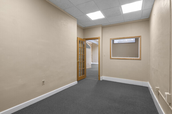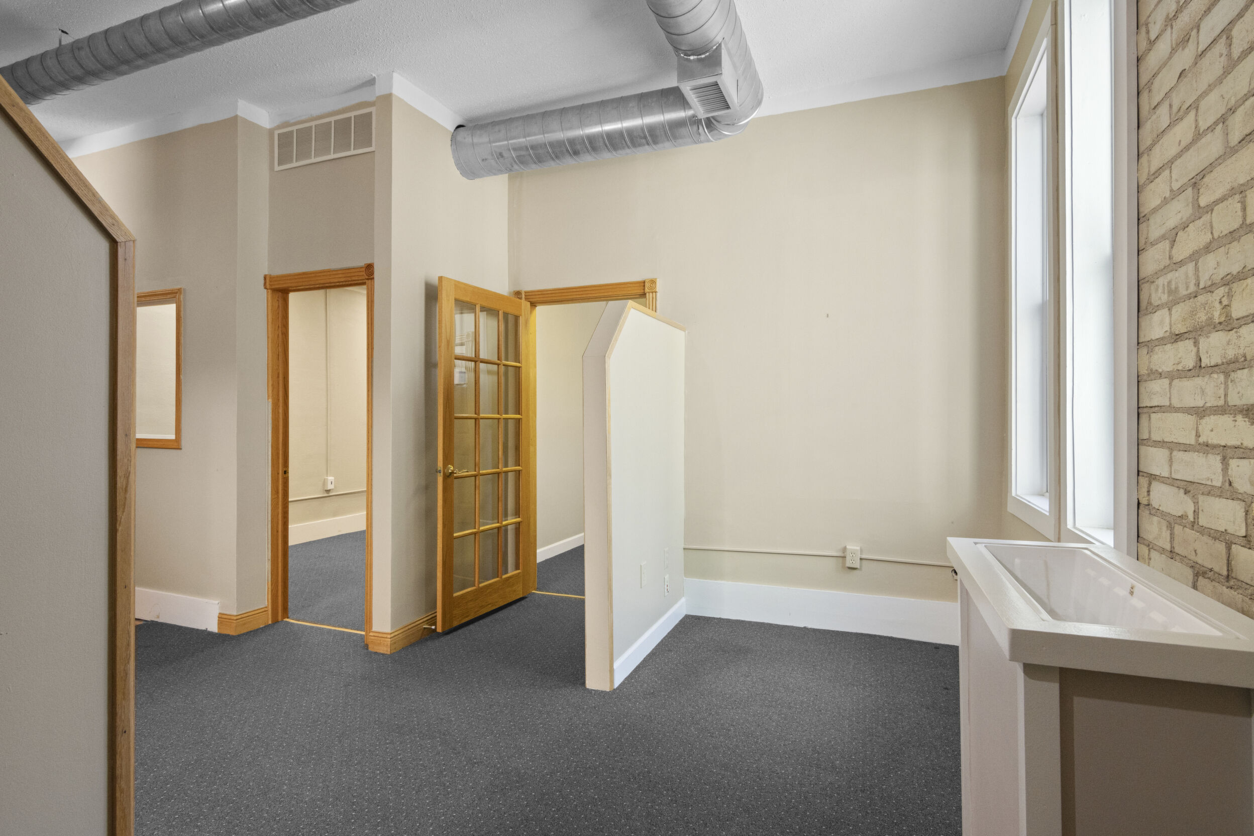 DOWNTOWN OFFICE SPACE! Suite 202. Renovated Upper Floor Office Space Includes 3 Private Offices -2 Work Stations - Built in Counter & Cupboards - French Glass Doors to Offices - Original Refinished Brick Walls - High Ceilings w/Exposed Ductwork - Skylights - Windows - etc. Rent Includes Electricity. Tenant Responsible for: Natural Gas/Heat - Trash - Phone/Computer. Shared Kitchenette & Restrooms & Hallway are nicely finished. Accessed by Wide Staircase to Front St & Rear Staircase to Alley.