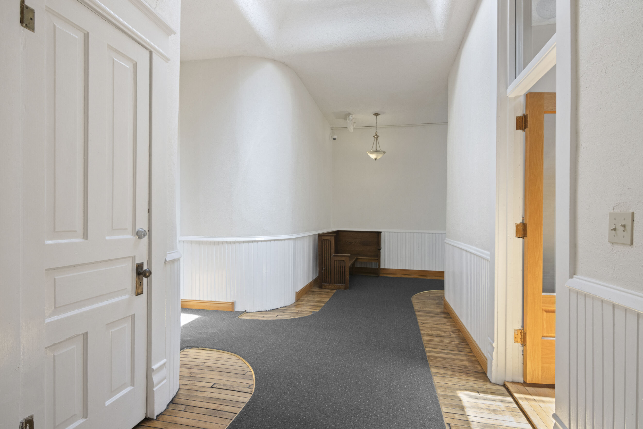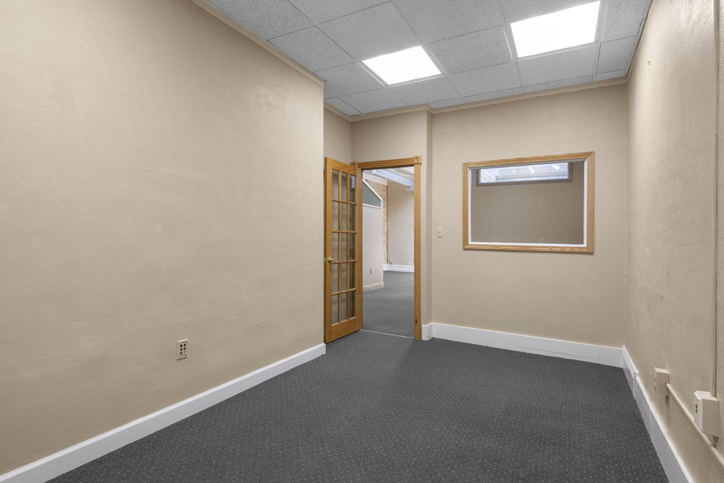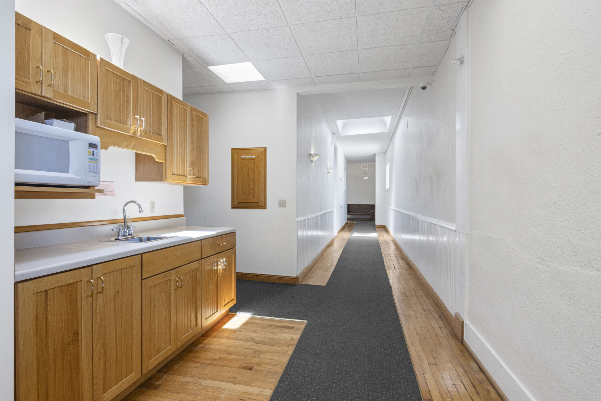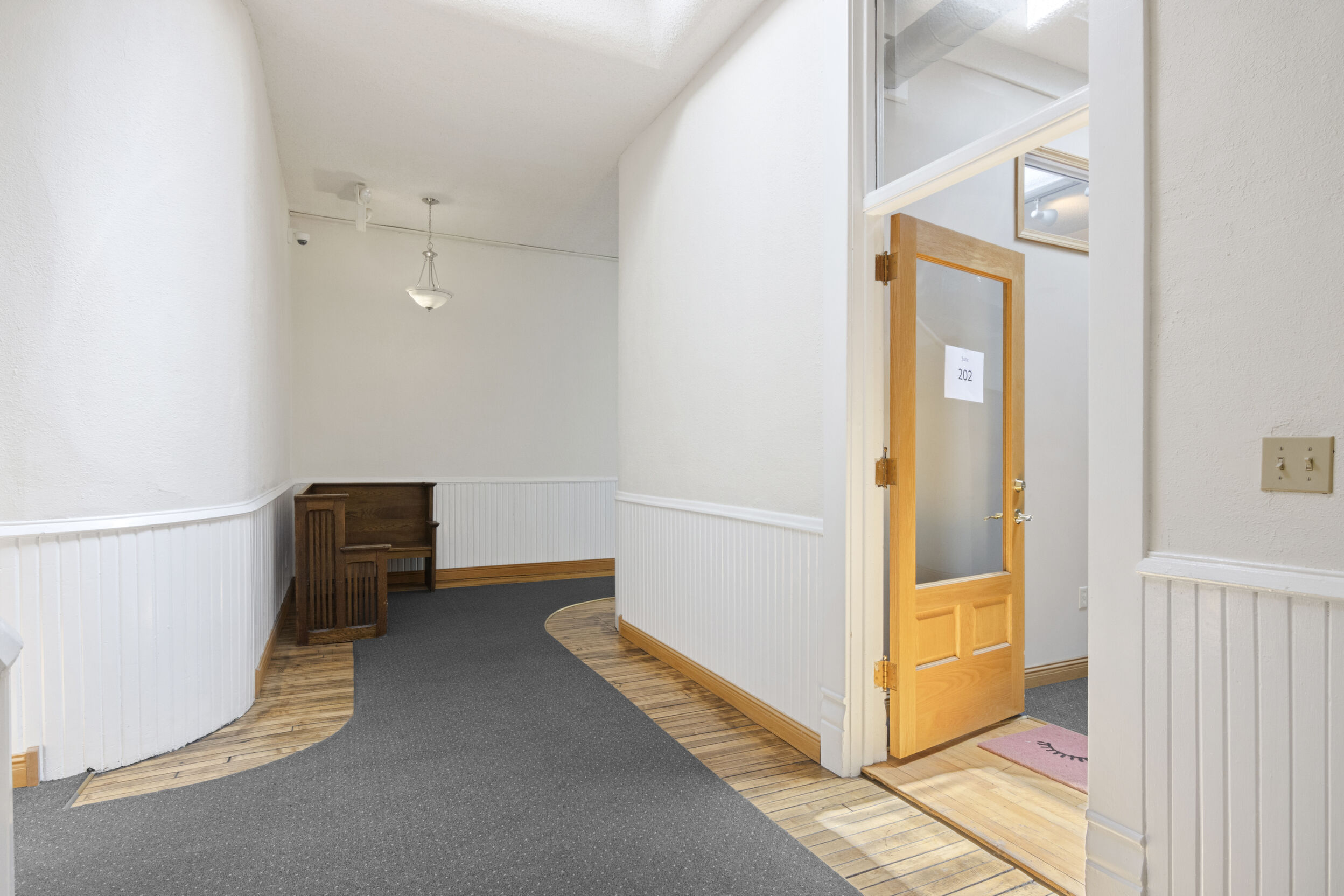 DOWNTOWN OFFICE SPACE! Suite 202. Renovated Upper Floor Office Space Includes 3 Private Offices -2 Work Stations - Built in Counter & Cupboards - French Glass Doors to Offices - Original Refinished Brick Walls - High Ceilings w/Exposed Ductwork - Skylights - Windows - etc. Rent Includes Electricity. Tenant Responsible for: Natural Gas/Heat - Trash - Phone/Computer. Shared Kitchenette & Restrooms & Hallway are nicely finished. Accessed by Wide Staircase to Front St & Rear Staircase to Alley.